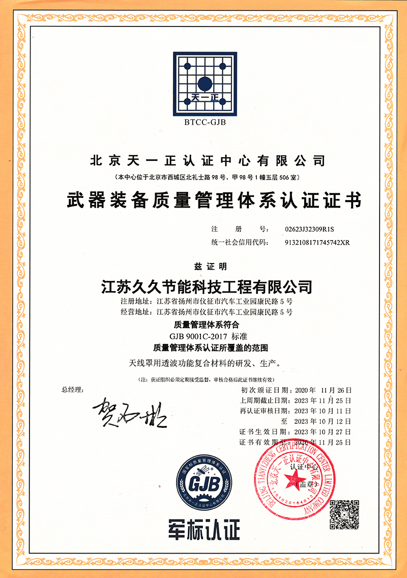武器裝備質(zhì)量管理體系認(rèn)證證書